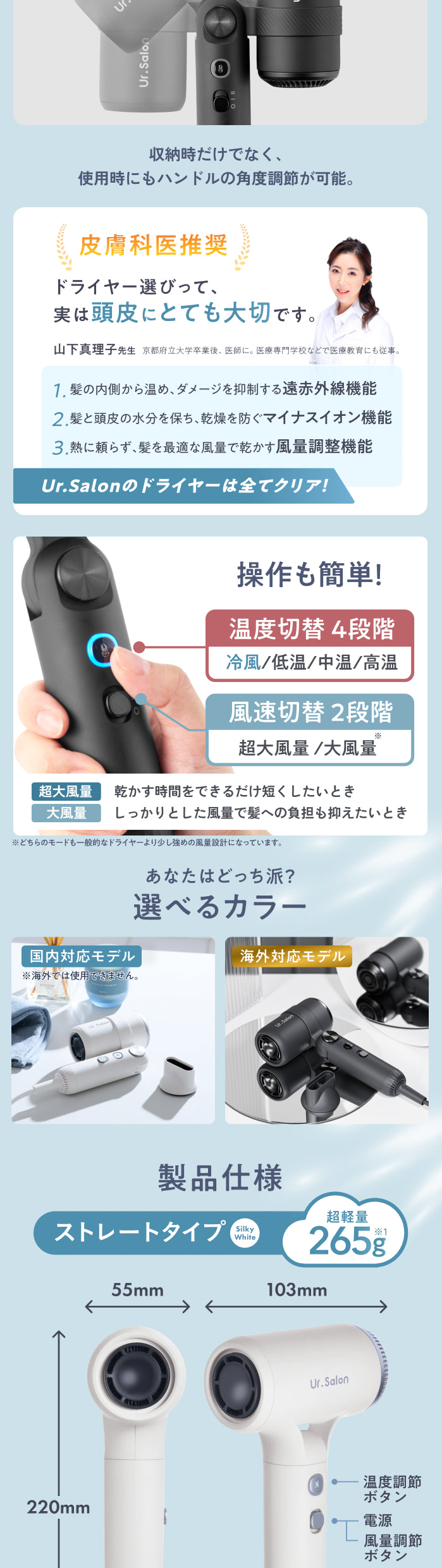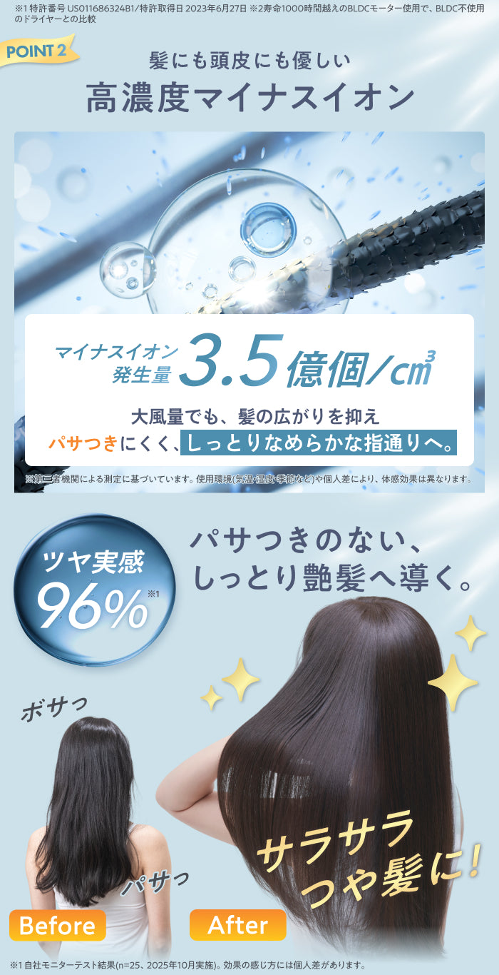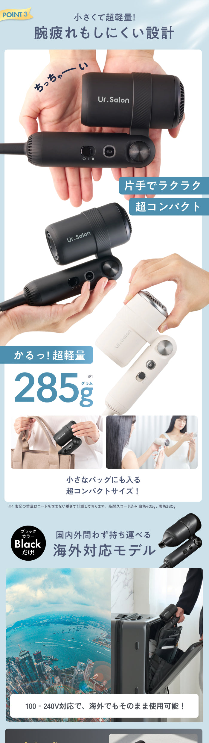 最大3.6㎥/minのプロ級ジェット風で、根元から一気に乾かし、毎日のドライ時間を大幅に短縮。速く乾くのに温度は高すぎず、やさしい風で髪をいたわりながら仕上げます。約285gの軽量ボディに加え、180°まで角度調整できる折りたたみハンドルを採用。腕を高く上げる必要がなく、長時間のドライでも疲れにくい設計です。小さく収納できるコンパクト設計で旅行やジム、出張にも便利。大風量・速乾・軽量を求める方にちょうどいい、海外対応(黒色)の高性能モデルです。