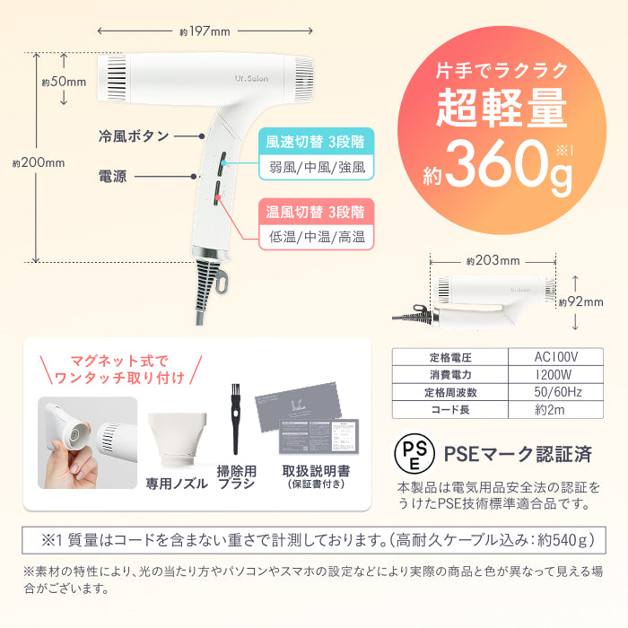 - セット内容:ドライヤー本体、ノズル、掃除用ブラシ、取扱説明書(保証書付)
